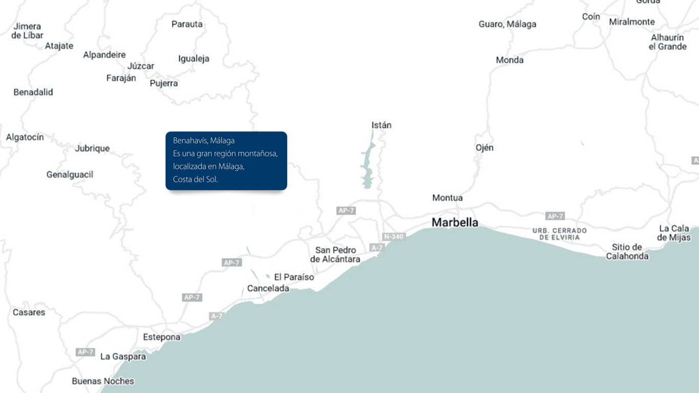 Conectividad: Situado a 7 km de la costa, a 25 minutos de Marbella y a menos de una hora del Aeropuerto Internacional y la estación de AVE de Málaga.